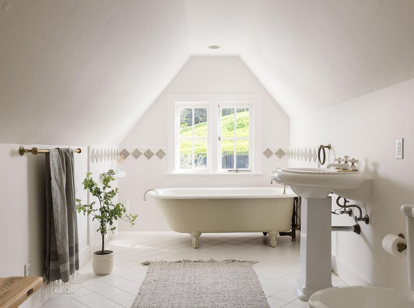 This inviting bathroom features a classic clawfoot bathtub, exuding vintage charm and relaxation. The sloped ceiling enhances the cozy atmosphere, complemented by natural light pouring through framed windows that offer serene views of the outdoors. Chic, neutral tones dominate the color scheme, creating a tranquil space. A delicate mosaic tile border adds a touch of elegance to the white walls. Family-friendly features include ample storage and easy-to-clean surfaces. A touch of greenery with a potted plant brings life to the room, while a soft woven rug underfoot invites comfort for daily routines, making it a perfect sanctuary for the family.