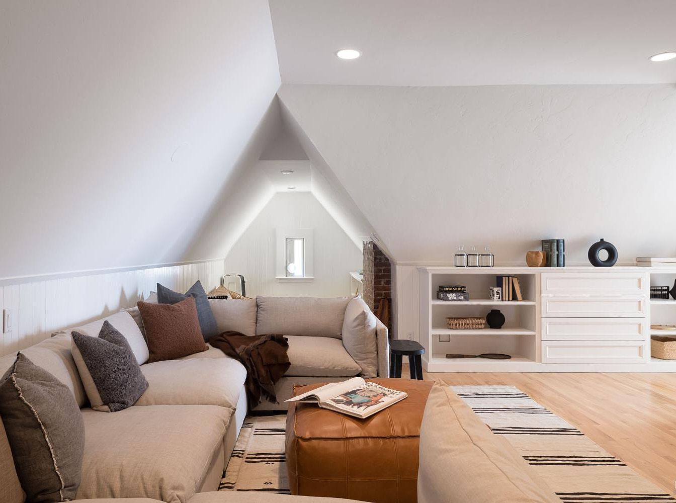 A beautifully designed attic lounge exudes warmth and comfort, featuring a spacious sectional sofa adorned with plush, textured pillows in neutral and earth tones. The angled ceiling enhances the cozy atmosphere, while soft, recessed lighting adds to the inviting ambiance. A leather ottoman serves as a practical centerpiece, ideal for relaxing or extra seating. Natural wood accents complement the light hardwood flooring, creating a harmonious color scheme. Minimalist shelving displays tasteful decorative items, fostering a clutter-free environment. This family-friendly retreat is perfect for cozy gatherings, reading nooks, or enjoying quiet moments away from the main living areas.