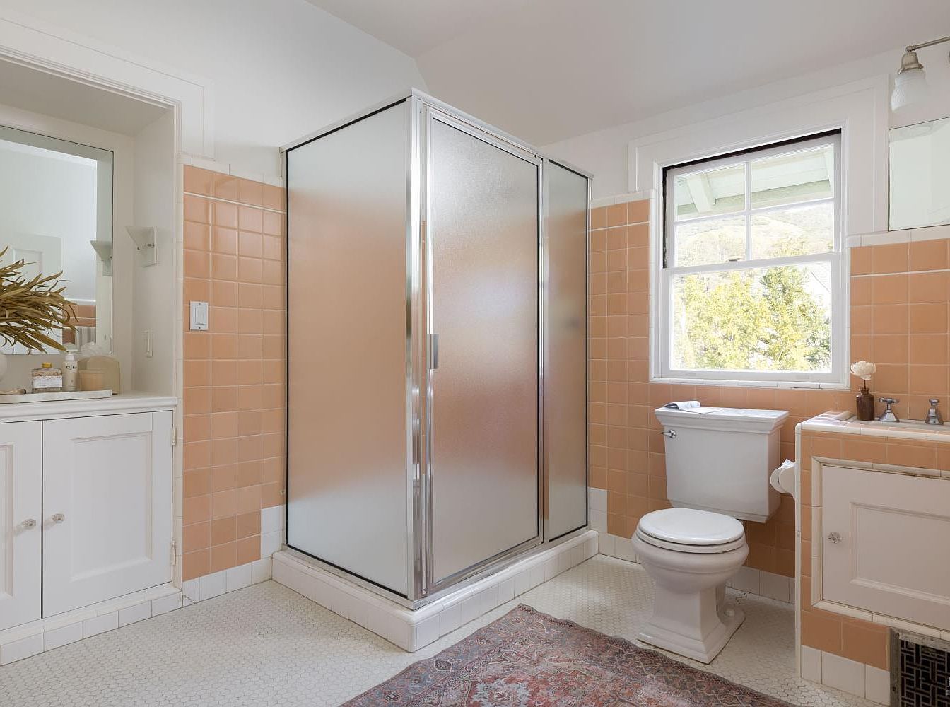 This inviting bathroom features a thoughtful layout with a seamless combination of functionality and charm. The frosted glass shower is accentuated by peach-toned tiles that create a warm and welcoming atmosphere. Classic white wainscoting provides contrast, while hexagonal floor tiles add a touch of elegance. A spacious vanity with cabinetry offers ample storage, complemented by decorative touches such as a stylish rug that adds comfort underfoot. Natural light floods in through the window, enhancing the overall bright ambiance, making this space perfect for relaxation and rejuvenation in a family-friendly home.