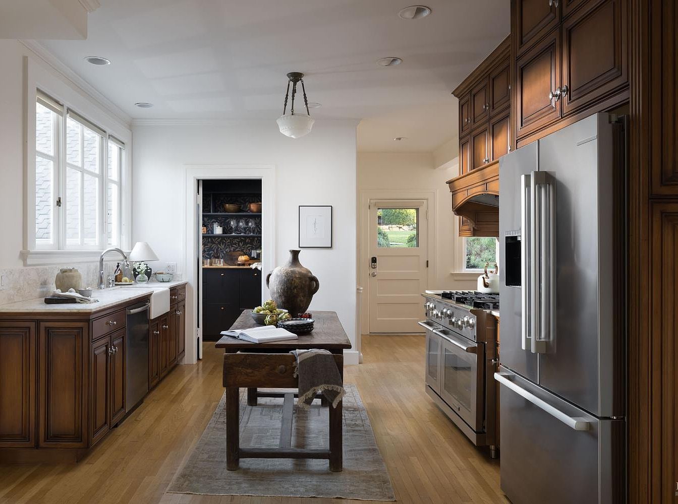 This spacious kitchen features a harmonious blend of traditional and contemporary elements. Rich wooden cabinetry adds warmth, while the bright countertops create an inviting contrast. A large farmhouse sink is positioned perfectly beneath expansive windows, allowing natural light to flood the space. The sturdy wooden table in the center serves as both a prep area and a casual dining spot, promoting family gatherings. Sparkling stainless steel appliances juxtapose the rustic elements, ensuring functionality without sacrificing style. The subtle color palette of whites and browns exudes tranquility, making it an ideal environment for both cooking and entertaining.