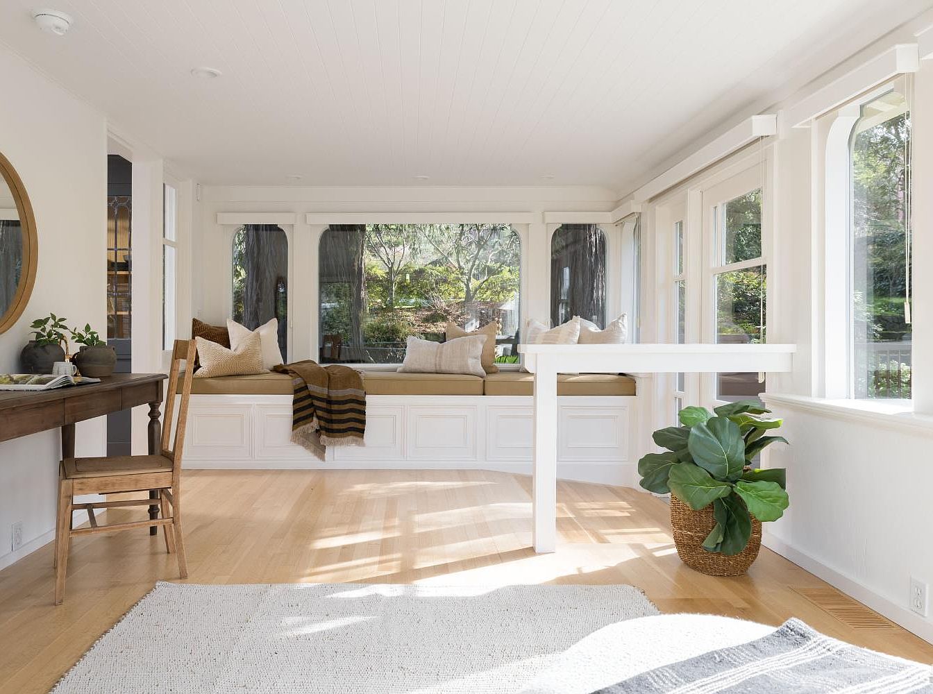 Bathed in natural light, this serene sunroom features a cozy built-in window seat adorned with soft cushions and decorative throws, perfect for relaxation or casual gatherings. The warm wood flooring complements the bright, airy white walls and ceiling, enhancing the sense of openness. A minimalist white table serves as a charming workspace, accompanied by a rustic wooden chair, ideal for reading or crafts. Lush greenery in a woven planter adds a touch of life and freshness to the space. Large windows frame picturesque outdoor views, inviting nature into this inviting, family-friendly retreat.