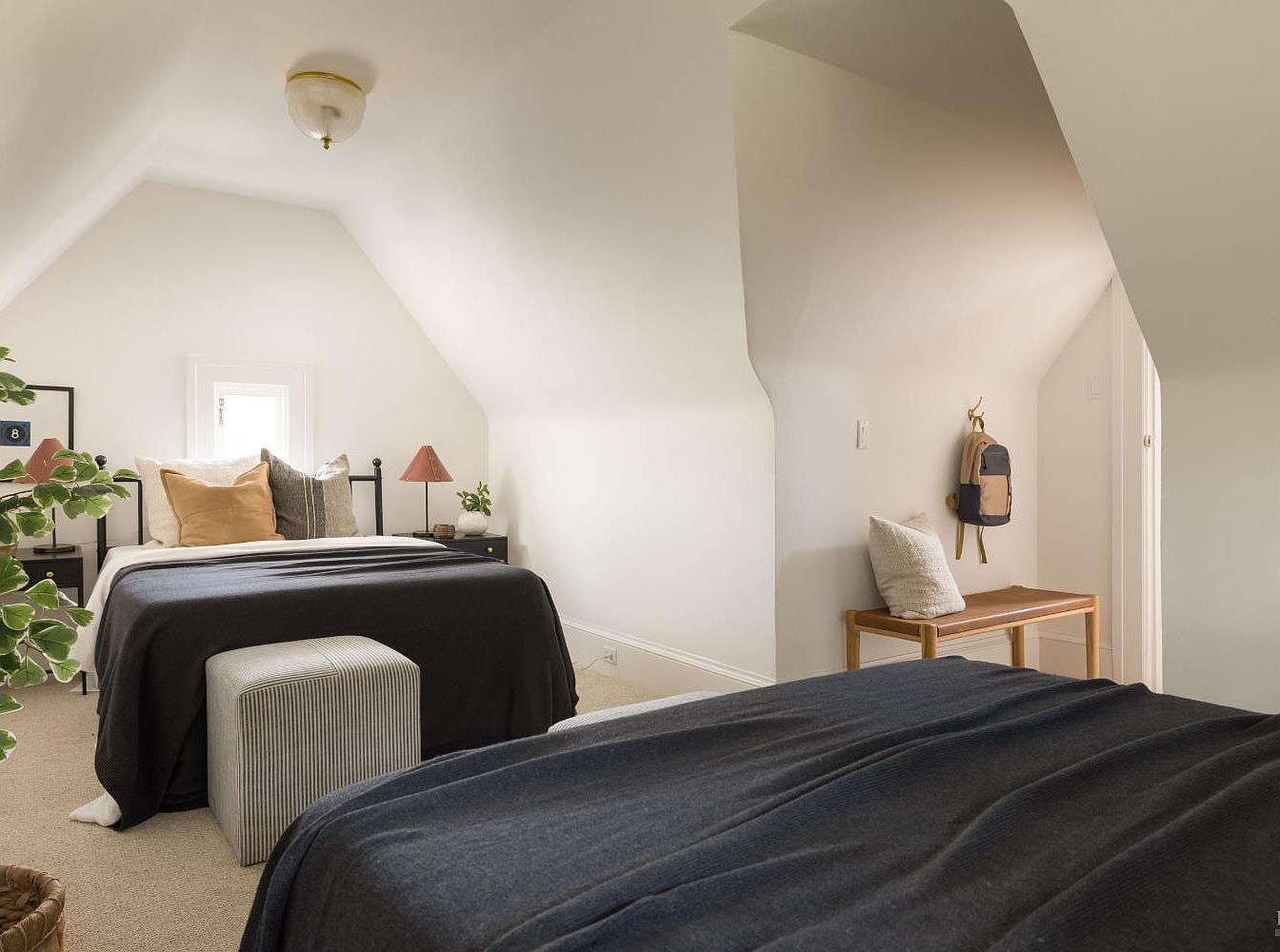This charming bedroom features two neatly arranged beds, each draped in soft, navy blankets, creating a warm and inviting atmosphere. The sloped ceilings add character, while the abundant natural light from the window brightens the space. A subtle color palette of cream walls contrasts beautifully with the dark bedding and decorative pillows, ensuring a cozy feel. A striped ottoman serves as a practical yet stylish addition, and a small side table accented by a modern lamp adds functionality. Decorative elements like greenery and a minimalist wooden bench enhance the room’s inviting aura, perfect for family relaxation.