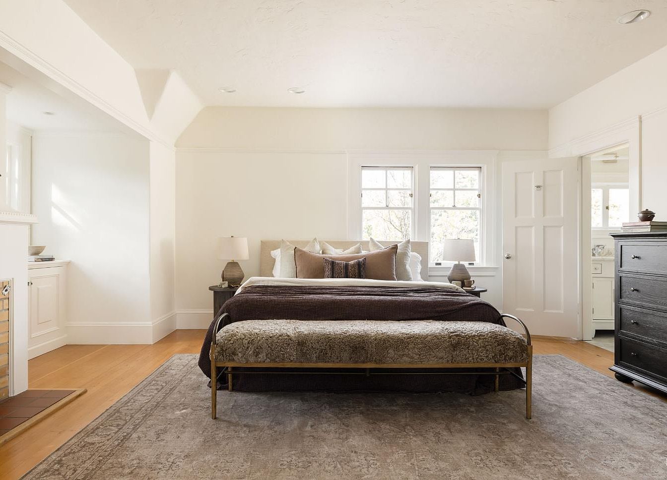 This serene master bedroom features high ceilings and an airy layout, making it a peaceful sanctuary. The neutral color palette of soft whites and warm beige creates a calming atmosphere, while rich textures are introduced through layered bedding and a plush area rug. A stylish upholstered bench at the foot of the bed adds functionality and comfort. Natural light floods the space from large windows, accentuated by tasteful lamps on either side of the bed. Family-friendly design elements include ample storage in the nearby dresser, ensuring a clutter-free environment that’s both inviting and relaxing.
