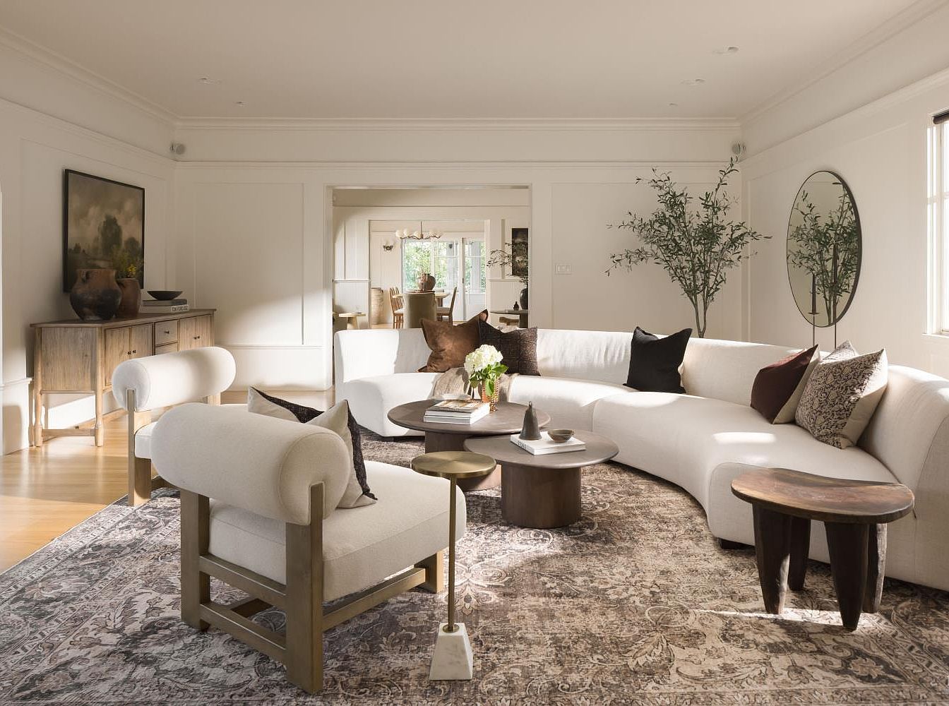 This cozy living room features a curvaceous sectional sofa, upholstered in a soft white fabric, creating an inviting atmosphere. The color palette combines warm neutrals and subtle earth tones, providing a serene backdrop. Two unique coffee tables in organic shapes are positioned centrally, accentuated by a plush area rug that adds texture. Beside the sofa, modern accent chairs complement the main seating with their rounded silhouettes and understated elegance. Natural light floods the space through large windows, enhancing the bright, airy feel. Decorative elements like potted greenery and tasteful artwork bring warmth and personal touches, perfect for family gatherings.