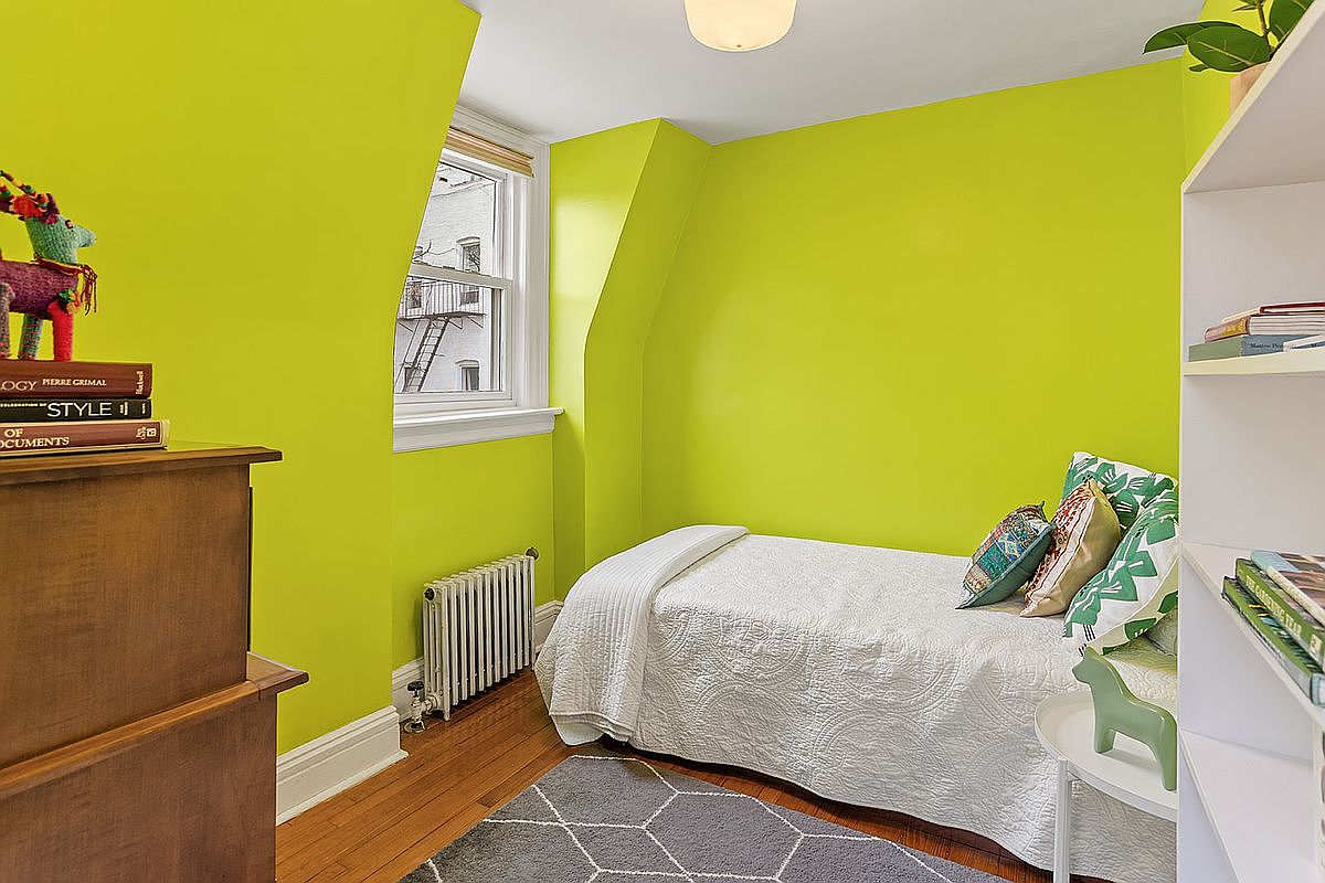 This vibrant kid’s bedroom features lively lime green walls that create an energetic atmosphere, perfect for inspiring creativity. The cozy twin bed, adorned with a textured white quilt and colorful decorative pillows, invites relaxation after playful days. Natural light pours in through a large window, framed by crisp white trim, offering views of the outside world and enhancing the room’s brightness. A classic wood dresser complements the playful design, while a white bookshelf provides easy access to books and toys, fostering a love for reading. The gray area rug adds an additional layer of comfort, tying the space together beautifully.
