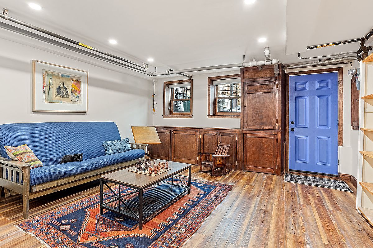 This inviting family den features a harmonious blend of modern comfort and classic design. A plush blue futon beckons for relaxation, complemented by a rustic wooden frame. A charming coffee table, adorned with a chess set, sits atop a vibrant area rug that brings warmth to the hardwood flooring. Natural light filters through small, embellished windows, emphasizing the rich, dark wooden cabinetry that lines the walls, providing ample storage. The eye-catching blue front door adds a pop of color, creating a welcoming atmosphere. This space is perfect for family gatherings or quiet evenings at home.