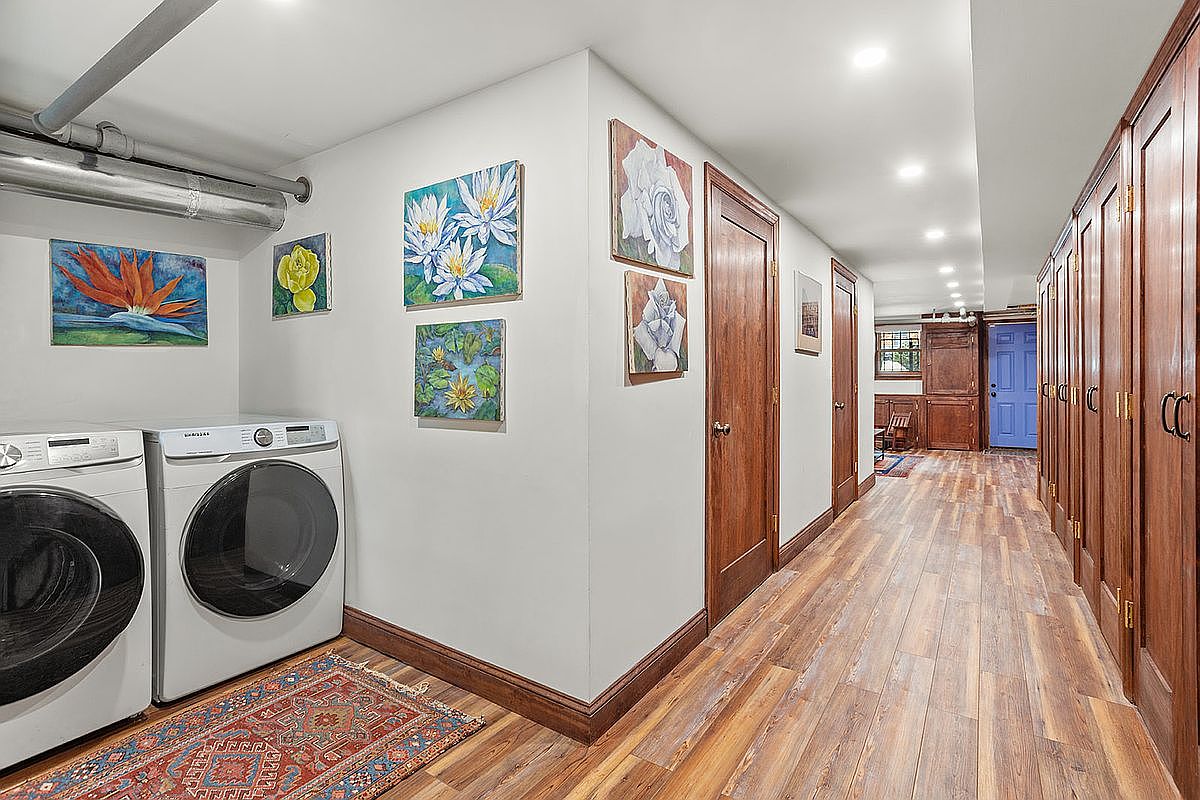 This inviting laundry room seamlessly blends functionality with aesthetics. A pair of modern, front-loading washers sits adjacent to a rich, wooden floor that adds warmth. The walls are adorned with vibrant floral artwork, bringing life and color to the space. Crisp white walls create a bright atmosphere, complemented by recessed lighting that ensures the area is well-lit. Ample cabinetry, featuring sleek hardware, provides practical storage solutions, making this space not only efficient but family-friendly. The arrangement encourages organization, while the tasteful decor transforms a utilitarian area into an enjoyable part of the home.