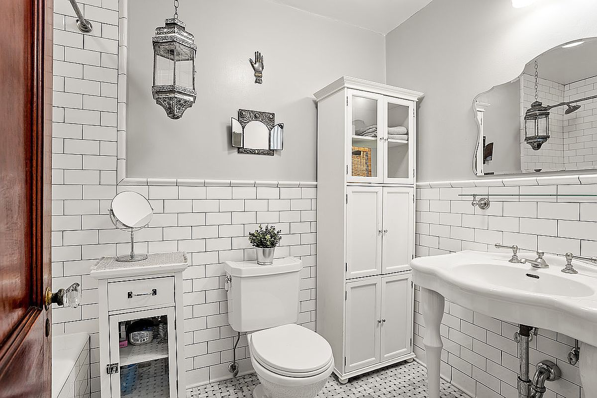 This bathroom features a fresh, contemporary design with classic white subway tiles lining the walls, creating a bright and spacious feel. The elegant, free-standing porcelain sink with vintage-inspired faucet adds charm, while a wall-mounted mirror enhances the sense of space. Ample storage is provided by a tall white cabinet and a small, stylish side table, ideal for towels and toiletries. Decorative accents, such as a shimmering lantern and a potted plant, introduce a touch of warmth. The overall color scheme of soft grays and whites ensures a calming, serene atmosphere, perfect for family-friendly functionality.