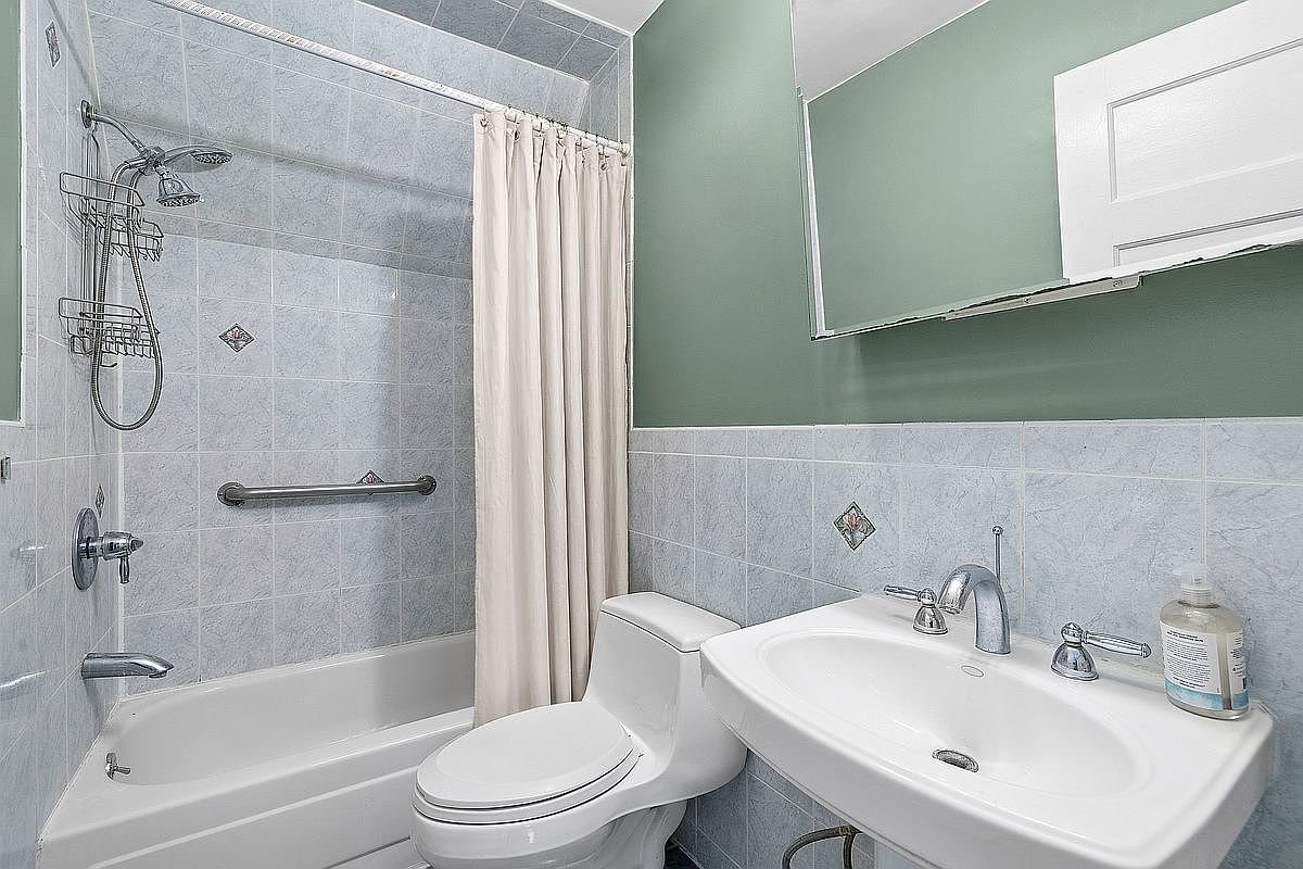 This bathroom exemplifies contemporary design with its clean lines and functional layout. The combination of light blue tiled walls and a soothing green accent creates a refreshing ambiance. A spacious bathtub, complemented by a curved shower rod and elegant curtain, encourages relaxation. The sleek vanity features a stylish sink and chrome fixtures, enhancing the modern aesthetic. Safety is prioritized with grab bars strategically placed for accessibility. Decorative tiles add a touch of personality, while the large mirror reflects light, making the space feel larger. Practical and family-friendly, this bathroom balances style and comfort seamlessly.