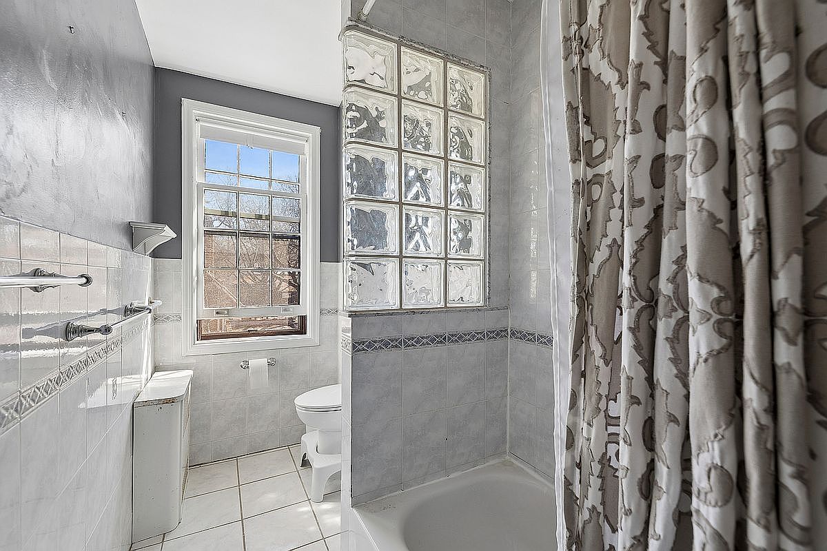 Bright and airy, this bathroom features a sophisticated blend of modern and classic design. The light gray walls create a calming ambiance, complemented by sleek white tiles. A large window allows natural light to illuminate the space, enhancing its openness. Glass block elements add a contemporary touch while maintaining privacy. Family-friendly features include easy-to-clean surfaces and a well-designed layout that maximizes functionality. The elegant shower curtain, with intricate patterns, introduces a subtle texture, harmonizing with the neutral color palette. Thoughtfully positioned accessories enhance usability, making this sanctuary both stylish and practical for everyday life.