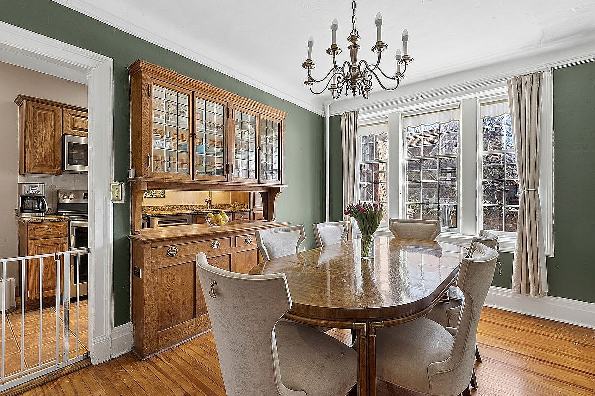 This charming dining room features a beautifully crafted wooden table surrounded by elegant upholstered chairs, perfect for family gatherings. The lush green walls create a warm and inviting ambiance, complemented by the natural light flowing in through large, multipanel windows adorned with soft drapes. A vintage glass-fronted hutch adds character and offers storage for dinnerware and accessories. The subtle shine of the polished hardwood floor enhances the room’s elegance, while a classic chandelier provides a timeless touch. An open doorway leads into the kitchen, promoting a seamless flow for entertaining and family meals.