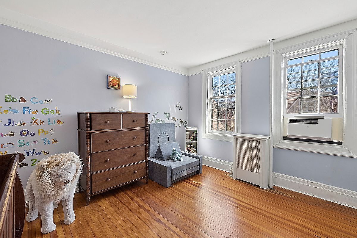 This inviting kid’s bedroom features a soft lavender hue that fosters a calming atmosphere. The layout showcases a blend of functionality and charm, featuring beautiful hardwood floors that add warmth. A stylish wooden dresser provides ample storage, contrasted by playful animal-themed décor on the wall. A cozy reading nook includes a soft, gray upholstered chair perfect for story time, beside a carefully organized bookshelf. Natural light pours in through large, classic windows, enhancing the room’s cheerful vibe. With thoughtful design elements and family-friendly features, this space is ideal for nurturing creativity and comfort.