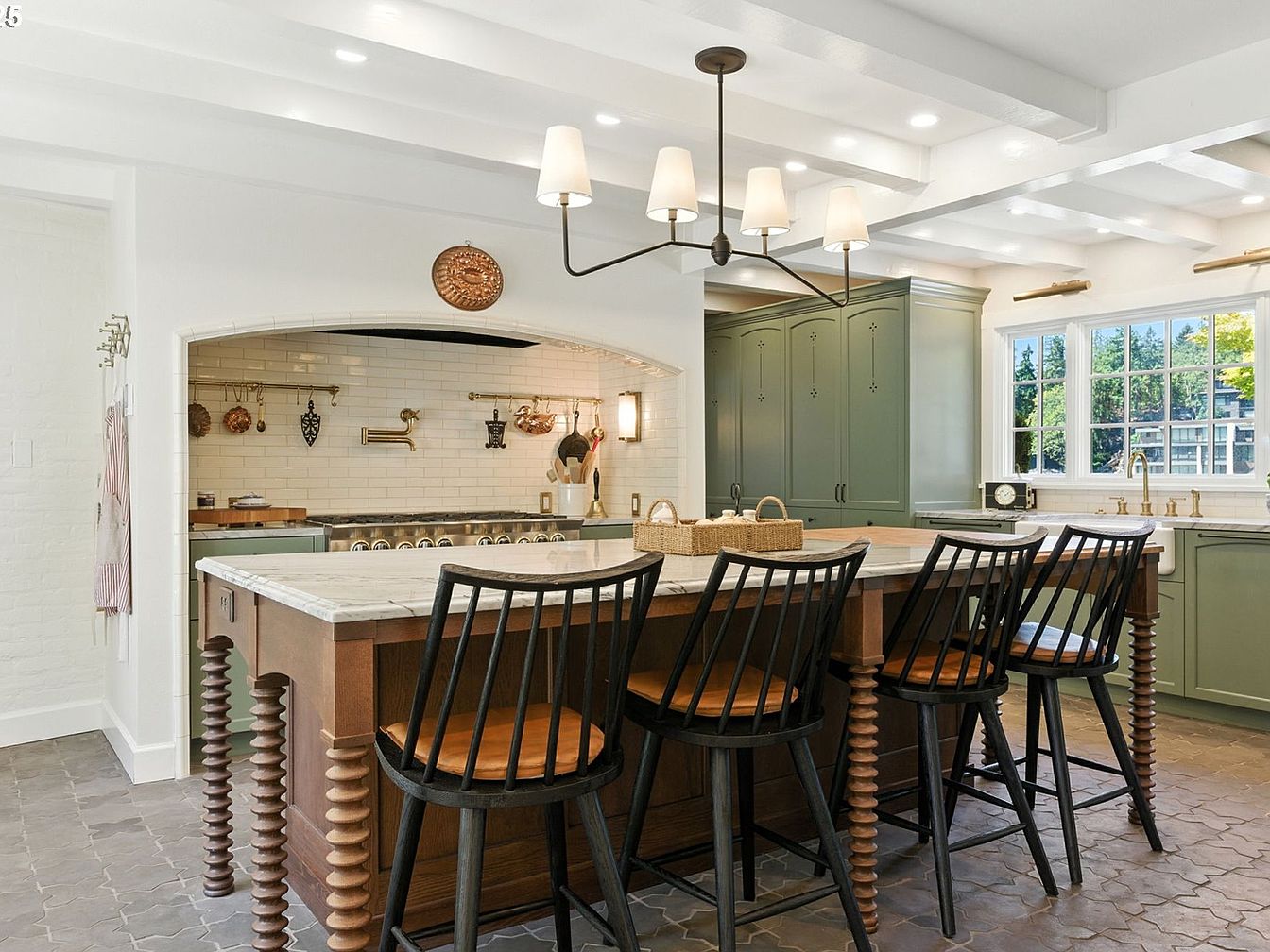 This charming kitchen showcases a harmonious blend of modern functionality and classic aesthetics. Featuring a spacious island with a stunning marble countertop, it invites family gatherings and casual dining. The dark wooden bar stools with leather seats complement the light-colored cabinetry, while the rich green hues of the upper cabinets provide a refreshing contrast. Exposed beams and a sleek light fixture add character to the ceiling, enhancing the open layout. Natural light floods the space through large windows, creating an inviting atmosphere. Thoughtfully designed, it balances elegance and practicality, making it perfect for both cooking and entertaining.