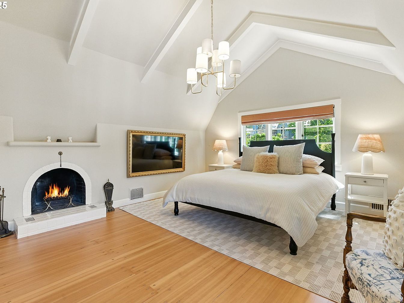 This master bedroom combines elegance with comfort, featuring a vaulted ceiling that enhances the spacious atmosphere. The calming color palette of soft whites and warm wood tones invites tranquility. A plush king-sized bed adorned with cozy pillows and a luxurious throw serves as the focal point. Flanking the bed are stylish nightstands with modern lamps, providing ample light for reading. The chic fireplace adds warmth, creating a cozy nook for relaxation. Large windows bring in natural light, while a patterned area rug adds texture. This family-friendly space is meticulously designed for restful nights and cheerful mornings.
