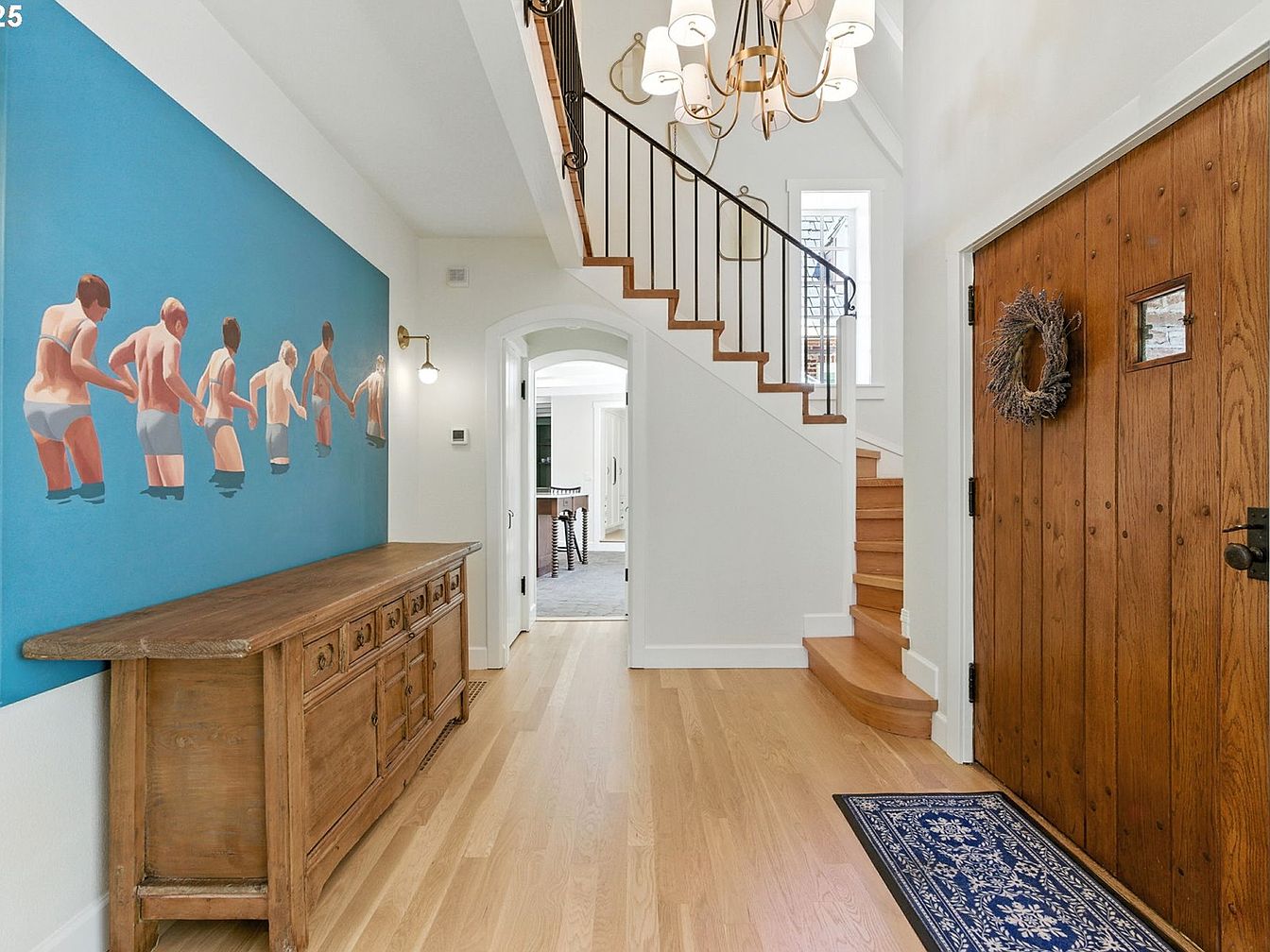 This welcoming entryway blends both charm and modern aesthetics, featuring a warm wooden front door adorned with a wreath that instantly invites guests in. The rustic wooden console table adds character, harmonizing beautifully with the vibrant blue mural, showcasing playful figures in water. Light floods through the large windows, illuminating the neutral palette of white walls and light oak flooring, enhancing the spacious feel. A stylish chandelier hangs above, while the curved staircase with black railings leads to the upper levels, offering a seamless flow from the entry to the rest of the home, perfect for family interactions.