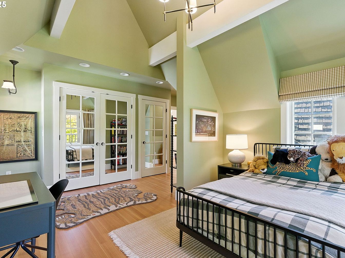This charming kid’s bedroom blends functionality with playful aesthetics. The room features a pitched ceiling that adds a sense of space and height, painted in a soothing green hue that promotes tranquility. A cozy black metal bed is topped with a plaid duvet and adorned with an assortment of stuffed animals, enhancing the room’s playful character. Light filters in through ample window space, complemented by stylish checkered shades. A clean, modern desk sits on a textured area rug, perfect for homework or creative projects. French doors lead to additional storage, maintaining organization and accessibility.