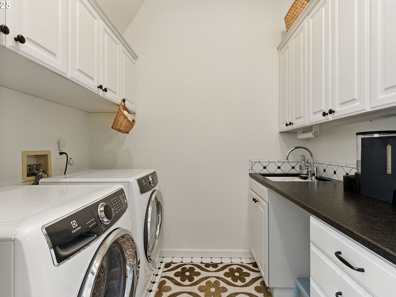 This laundry room exemplifies a blend of practicality and style, showcasing a functional layout with modern appliances neatly integrated along one wall. The elegant white cabinetry offers ample storage, complemented by matte black knobs providing a chic contrast. A sophisticated black countertop stretches across, creating an efficient workspace for folding or sorting laundry. Below, the patterned floor tile adds a touch of character, infusing warmth and visual interest. An additional sink is conveniently positioned for handwashing or delicate items, while overhead baskets ensure organization. Thoughtful positioning maximizes space, making it a family-friendly, organized environment.