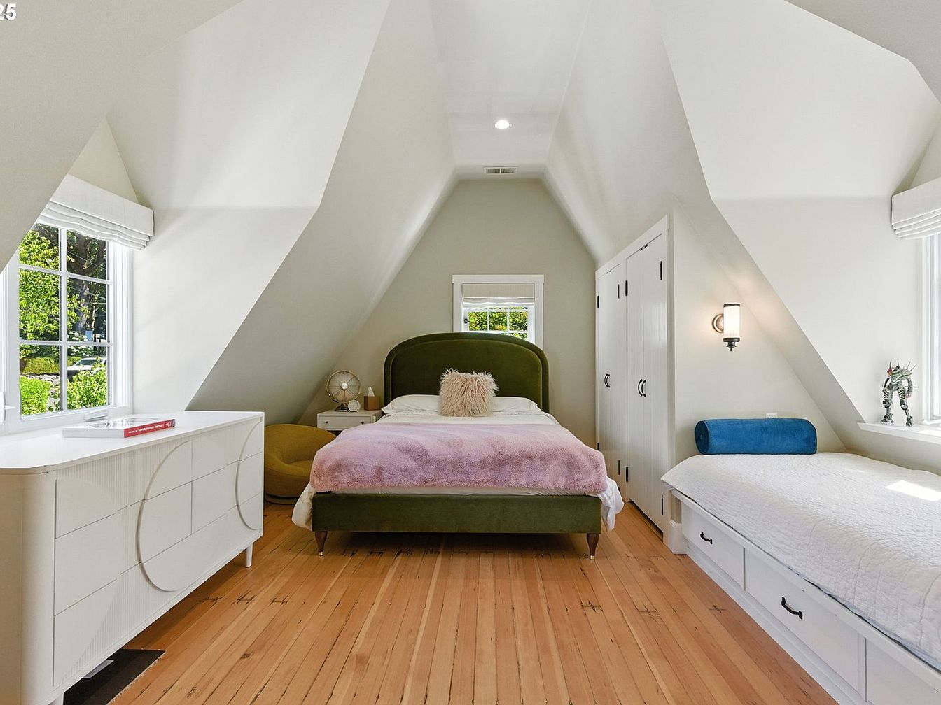 This charming guest bedroom features a cozy layout with sloped ceilings that enhance its character. Natural light floods through large windows, showcasing the serene green bed adorned with plush bedding and a playful pink throw. A modern white dresser complements the beautiful natural wood flooring. The room incorporates user-friendly elements, such as a cozy reading nook with a pouf and a minimalist twin bed with elegant storage underneath. Subtle decor elements, like warm lighting fixtures and a stylish side table, contribute to an inviting atmosphere, perfect for family and friends visiting their next retreat or weekend getaway.