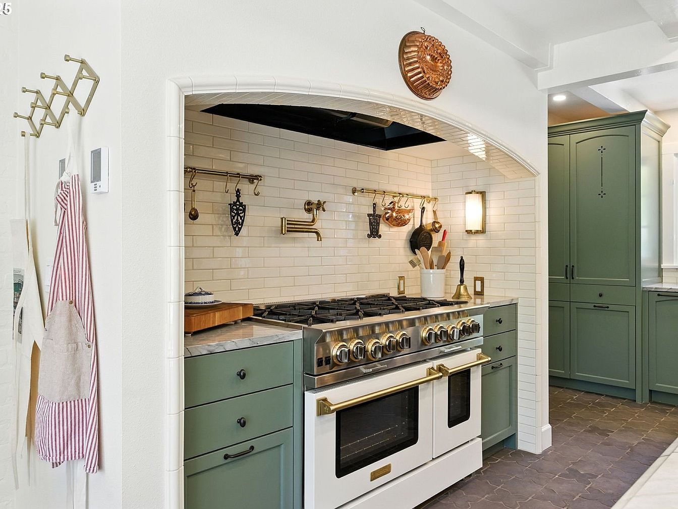 This inviting kitchen combines functionality with style, featuring a harmonious blend of muted green cabinets and sleek white subway tiles that enhance its bright ambiance. The spacious layout includes a professional-grade oven, making meal preparations a breeze. Brass accents, such as the elegant faucet and open pot racks, add a touch of sophistication while maintaining a warm, welcoming feel. Thoughtful details abound, including apron hooks for convenience and under-cabinet lighting that highlights the workspace. The flooring, with its earthy tone, complements the overall aesthetic, creating a cozy yet refined environment perfect for family gatherings.
