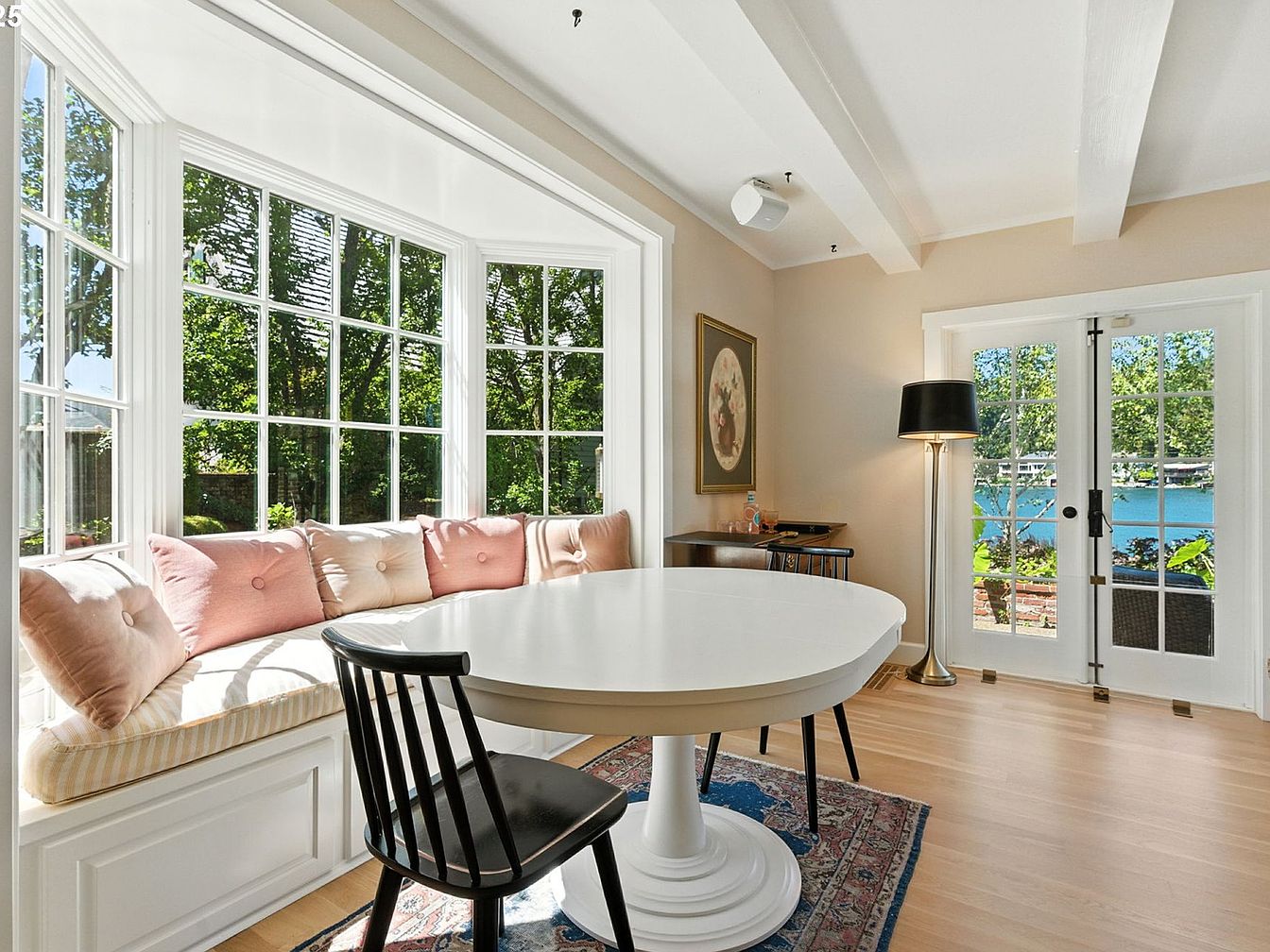 This charming breakfast nook features a built-in window seat adorned with soft, pastel cushions, inviting relaxation and casual dining. Natural light floods the space through expansive windows, seamlessly connecting indoor comfort with the serene outdoor landscape. A round white dining table stands at the center, complemented by elegant black chairs, adding a modern touch. Light wood flooring enhances the airy feel of the room, while the neutral wall color allows the furniture to stand out. Architectural details like beamed ceilings and classic window molding elevate the aesthetic, making it a perfect gathering spot for family meals and morning coffee.