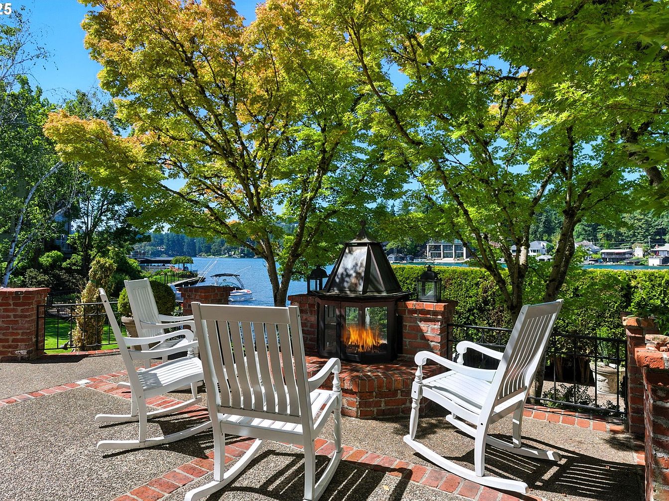This charming outdoor patio features a welcoming arrangement of white rocking chairs arranged around a cozy brick fireplace, perfect for family gatherings. The natural brick and warm tones of the landscaping harmonize beautifully with vibrant trees, adding a touch of serenity. A stunning water view serves as a picturesque backdrop, enhancing the tranquil atmosphere. The spacious layout encourages relaxation, with ample room for movement, while the combination of sunlight and shade creates a balanced environment. This outdoor space is designed to bring family and friends together, fostering connection in an inviting and aesthetically pleasing setting.