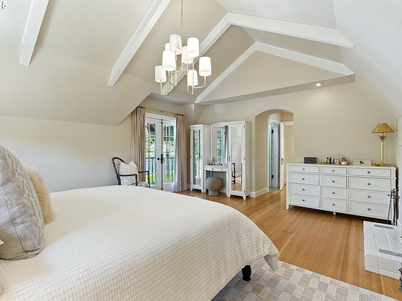 This inviting master bedroom showcases a harmonious blend of modern elegance and cozy comfort. Featuring vaulted ceilings with exposed beams, the space feels open and airy. A soft neutral color palette enhances the tranquil atmosphere, complemented by delicate textiles and plush bedding. The focal point is a stylish, well-proportioned bed, accompanied by a chic nightstand and an artfully designed dresser. Natural light floods in through double French doors, opening to a serene outdoor view, while a seating area provides a perfect spot to relax. Ample storage and thoughtfully placed mirrors add to the family-friendly functionality.