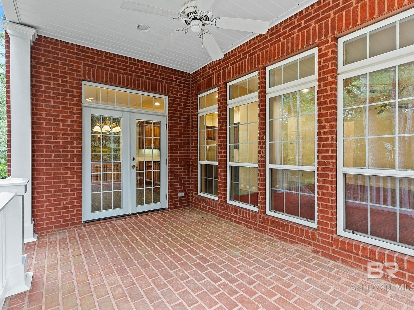 A spacious covered patio with classic red brick flooring and walls creates a welcoming space ideal for gatherings or family relaxation. Large, grid-patterned windows and French doors allow ample natural light to flood the interior rooms, giving a seamless indoor-outdoor connection. The white beadboard ceiling features built-in lighting and a ceiling fan, enhancing comfort on warm afternoons. The open layout offers plenty of room for outdoor seating or a play area for children, making the patio both chic and functional. Neutral tones and quality finishes ensure the space feels both timeless and family-friendly, perfect for entertaining or unwinding.