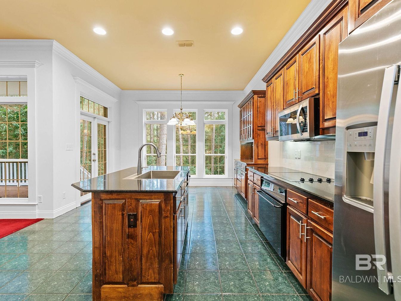 This spacious kitchen highlights a generous island with a built-in sink, perfect for meal prep or casual family gatherings. The rich wooden cabinetry offers ample storage across the length of the wall, paired elegantly with sleek black countertops. Stainless steel appliances, including a double-door fridge and built-in microwave, add modern convenience. Large windows and glass doors bathe the space in natural light, creating a bright and welcoming atmosphere for both everyday living and entertaining. Classic green-tiled floors and white trim detail offer timeless sophistication, while the open layout allows easy access to outdoor areas for family-friendly functionality.