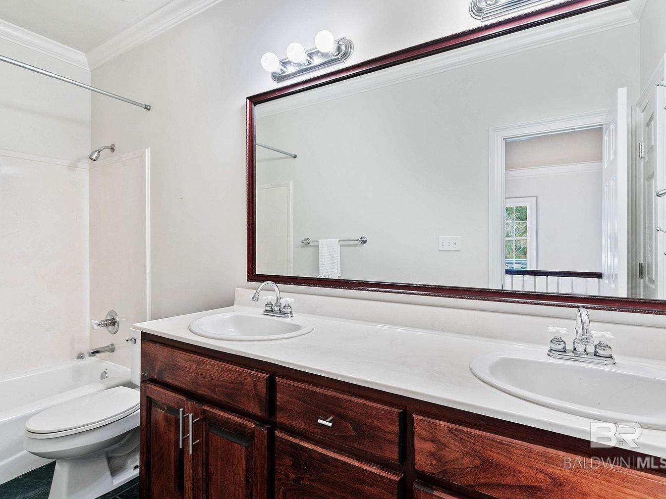A spacious bathroom featuring a double vanity with dark wood cabinets, topped by a sleek white countertop and paired with two sinks, perfect for busy families or shared mornings. Classic silver fixtures and a generously sized mirror framed in espresso wood add elegance, complementing the fresh white walls and crown molding. The room includes a full-size bathtub and shower combination, making it practical for children or guests. Soft lighting above the mirror brightens the space, while ample cabinet storage keeps essentials organized and out of reach, promoting a clutter-free, family-friendly environment ideal for daily routines.