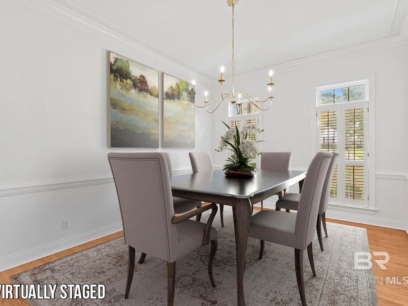 A bright and inviting dining area features a classic rectangular table surrounded by six upholstered chairs, offering ample seating for family gatherings or dinner parties. Large windows with wooden shutters allow natural light to fill the space, adding warmth and charm, while the neutral color palette of soft grays and whites promotes calm and cohesion. Crown molding and wainscoting add architectural interest and sophistication. A contemporary art piece above the chair rail provides a focal point, and a central chandelier brings an elegant touch. The plush area rug grounds the room, making it both welcoming and kid-friendly for everyday use.