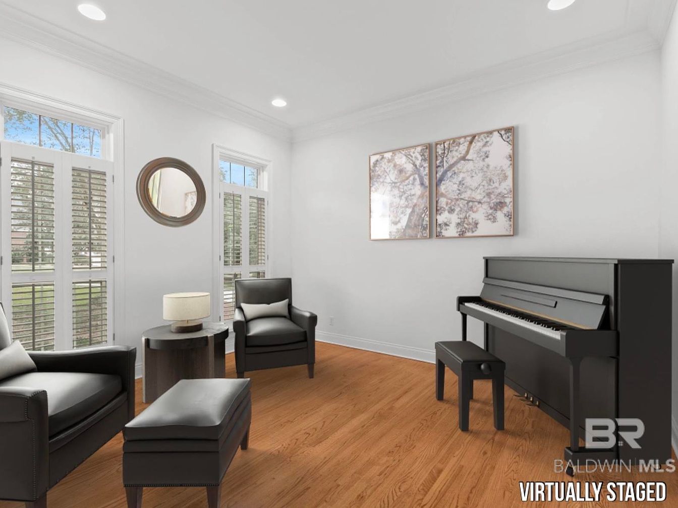 A bright and inviting music room welcomes natural light through tall windows accented with classic white shutters, creating a serene spot for relaxation and creativity. The polished hardwood floors complement the crisp white walls, while two comfortable leather armchairs and a matching ottoman provide a cozy seating area perfect for family conversations or supervising music practice. The sleek upright piano becomes a focal point, flanked by tasteful artwork and a simple round mirror for added elegance. The uncluttered layout ensures ample space for gatherings, making it an ideal multi-purpose room for both adults and children to enjoy music and quiet leisure.