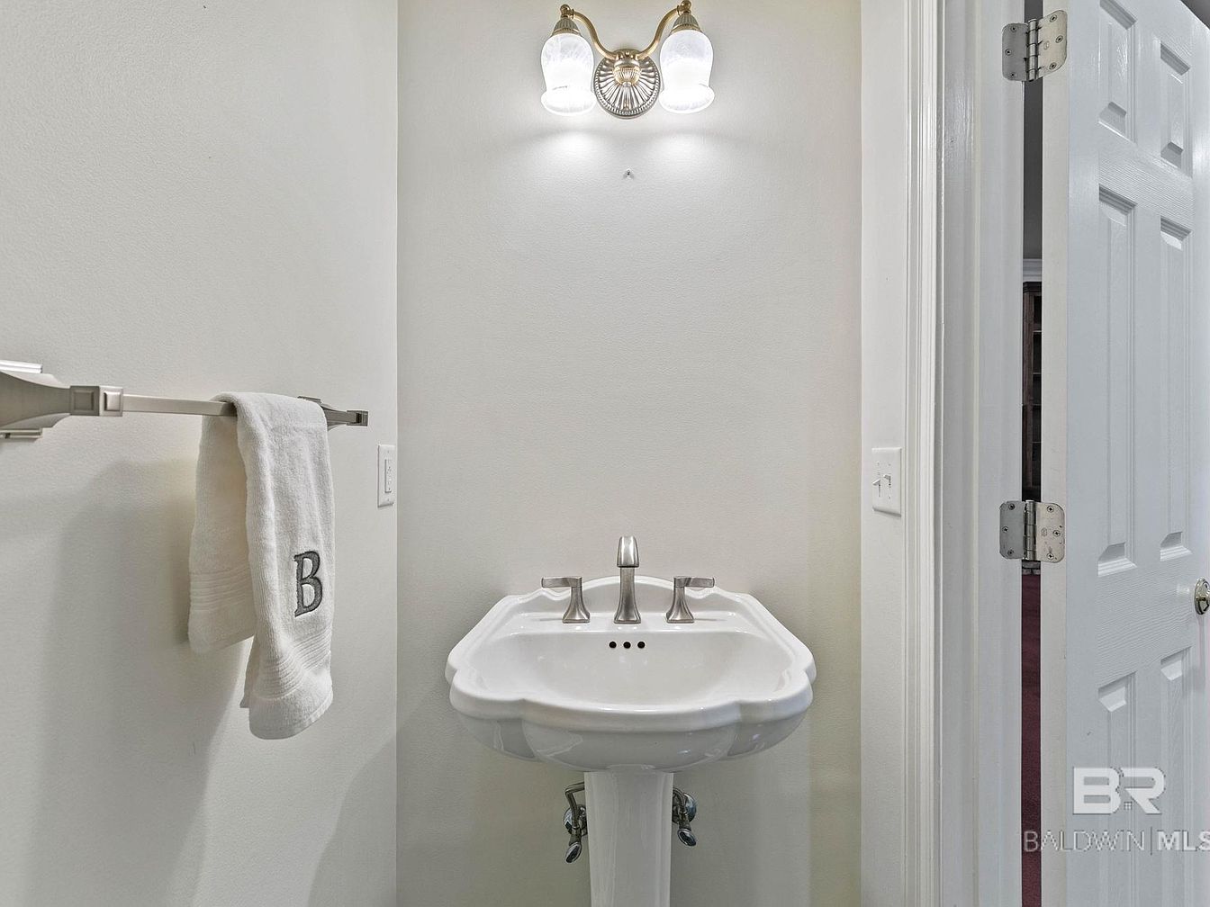 An inviting powder room features a classic pedestal sink with elegant curves and nickel-finish fixtures, making the space feel refined yet approachable. Soft neutral walls create an open, clean ambiance while a white hand towel bearing a monogrammed ‘B’ adds a personalized touch. Above the sink, a decorative sconce emits warm light, enhancing the cozy atmosphere. The overall layout is compact, maximizing efficiency and accessibility, perfect for family members and guests. With its uncluttered surfaces and timeless color palette, this powder room seamlessly balances practicality with subtle sophistication, making it ideal for both daily routines and entertaining visitors.