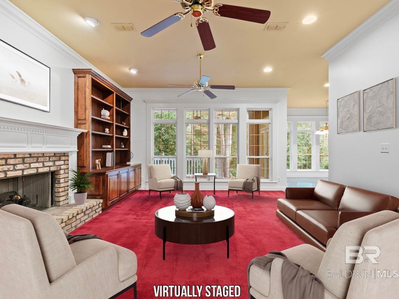 This spacious living room offers a warm family-friendly environment, featuring plush red carpeting that adds comfort and a pop of color. Large windows flood the space with natural light and provide tranquil views of the outdoors, making it ideal for gatherings or quiet relaxation. The focal point is a charming brick fireplace, accented by white molding, with built-in wooden shelving perfect for displaying personal mementos and books. Neutral-toned furniture, including soft armchairs and a sleek leather sofa, deliver both style and practicality. Overhead ceiling fans enhance air circulation, while simple wall art and accessories complete the inviting and elegant look.