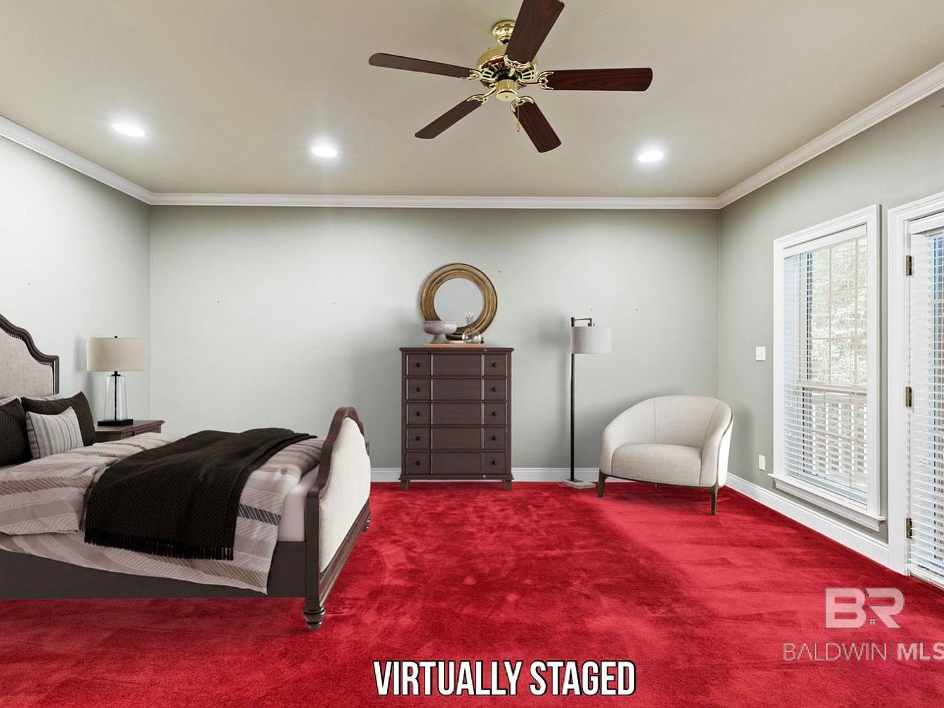 A spacious and inviting primary bedroom featuring plush red carpeting that adds warmth and energy, balanced by soft pastel-gray walls and crisp white trim. The stately bed, dressed in neutral linens and dark accent throws, is paired with matching nightstands and a classic dresser, providing ample storage. A comfortable armchair by the window nook offers a quiet spot for reading or relaxation, ideal for unwinding. Large windows fill the space with natural light, while recessed lighting and a ceiling fan ensure comfort day or night. The open layout, calming colors, and thoughtful furnishings create a tranquil, family-friendly sanctuary.