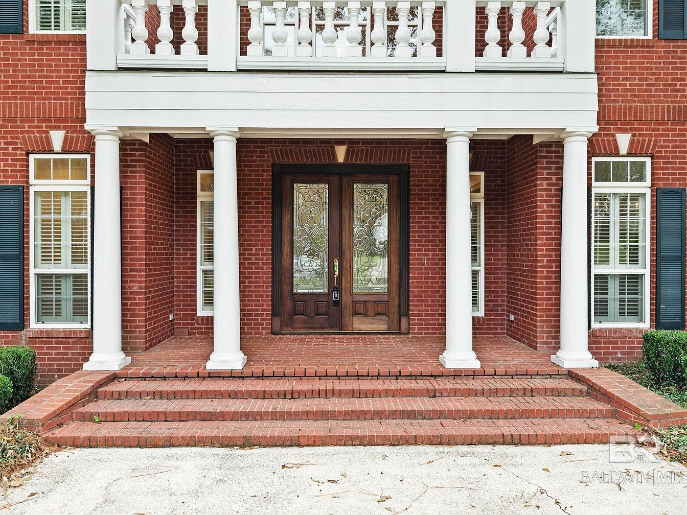 A welcoming brick porch accented by elegant white columns and traditional balustrades frames the entrance of this American home. The symmetrical design, complete with classic double glass doors featuring ornate decorative panels, provides a timeless and stately curb appeal. Wide, shallow steps lead up to the door, making access easy for all family members, including young children. Flanked by tall windows with plantation shutters and navy blue shutters for added contrast, the porch feels bright, secure, and inviting. This area is perfect for greeting guests or pausing before entering the main living space, offering both function and sophisticated style.
