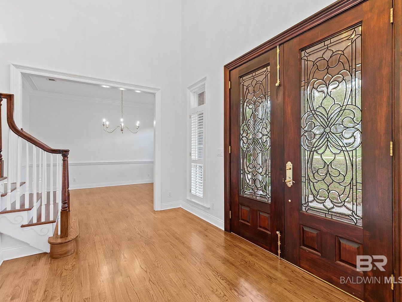 A grand and welcoming entryway sets the tone for the home, featuring rich hardwood flooring and elegant double doors with ornate glasswork that fill the space with natural light. The open layout connects seamlessly to a formal dining area, perfect for family gatherings and celebrations. The sweeping staircase with dark wooden handrails and crisp white balusters adds sophistication, while the neutral walls and classic trim offer a timeless backdrop suitable for any décor style. Thoughtful features like wide walkways and ample lighting make this space both accessible and inviting for families with children or guests.