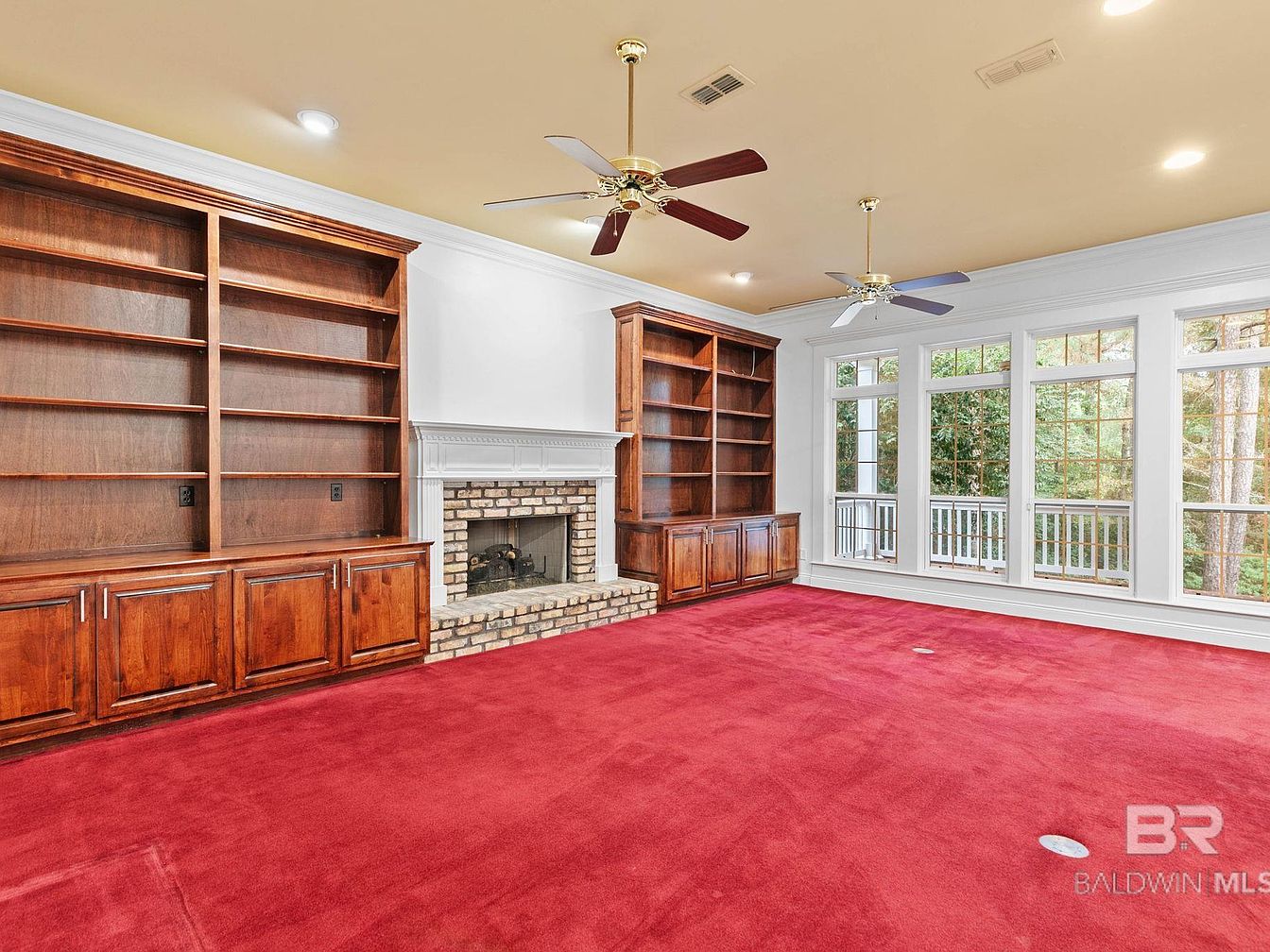 This spacious living room blends comfort and elegance, featuring large picture windows that flood the space with natural light and provide serene views of the surrounding greenery. The standout red carpeting brings warmth and vibrancy, making it ideal for family gatherings and child-friendly activities. On one side, custom-built wooden bookshelves with lower cabinets frame a classic brick fireplace with a detailed white mantel, offering a focal point and ample storage for books or games. Dual ceiling fans and recessed lighting enhance the airy, inviting feel, complemented by refined crown molding and neutral wall tones for a timeless look.