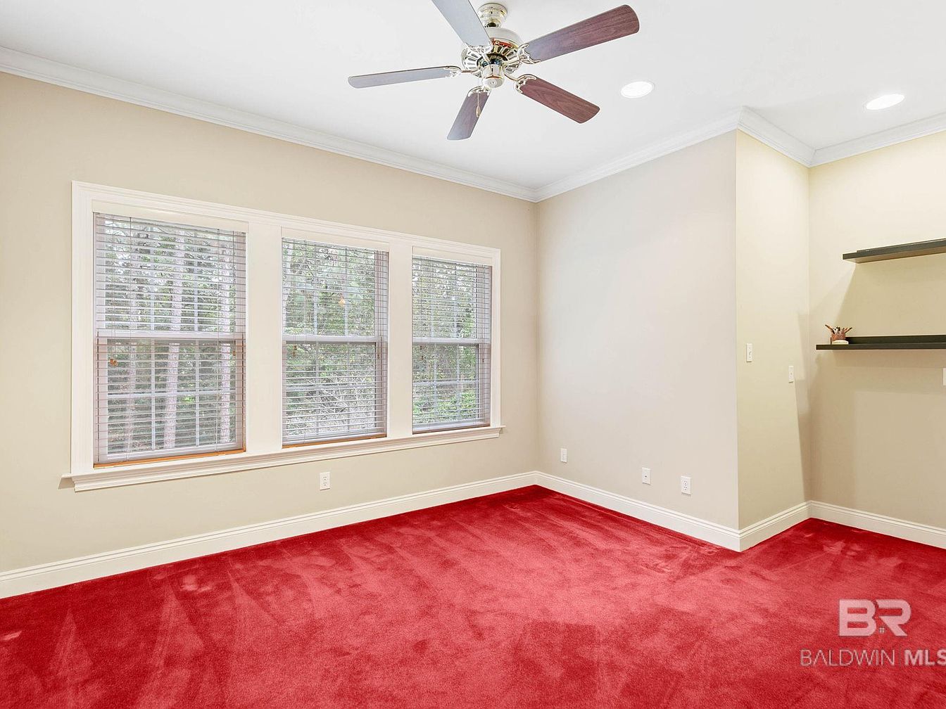 Bright natural light fills the bedroom through three large windows, providing a serene view of the wooded landscape outside. The room features a bold, plush red carpet that adds warmth and vibrancy, complementing the soft beige walls for a balanced and inviting atmosphere. A ceiling fan with wood finish blades offers comfort, while built-in recessed lighting adds modern appeal. Family-friendly elements include spacious open floors ideal for play or furniture arrangement, and floating shelves in the corner for displaying books or toys. Crisp white trim and detailed molding complete the sophisticated, yet welcoming aesthetic, perfect for children or guests.
