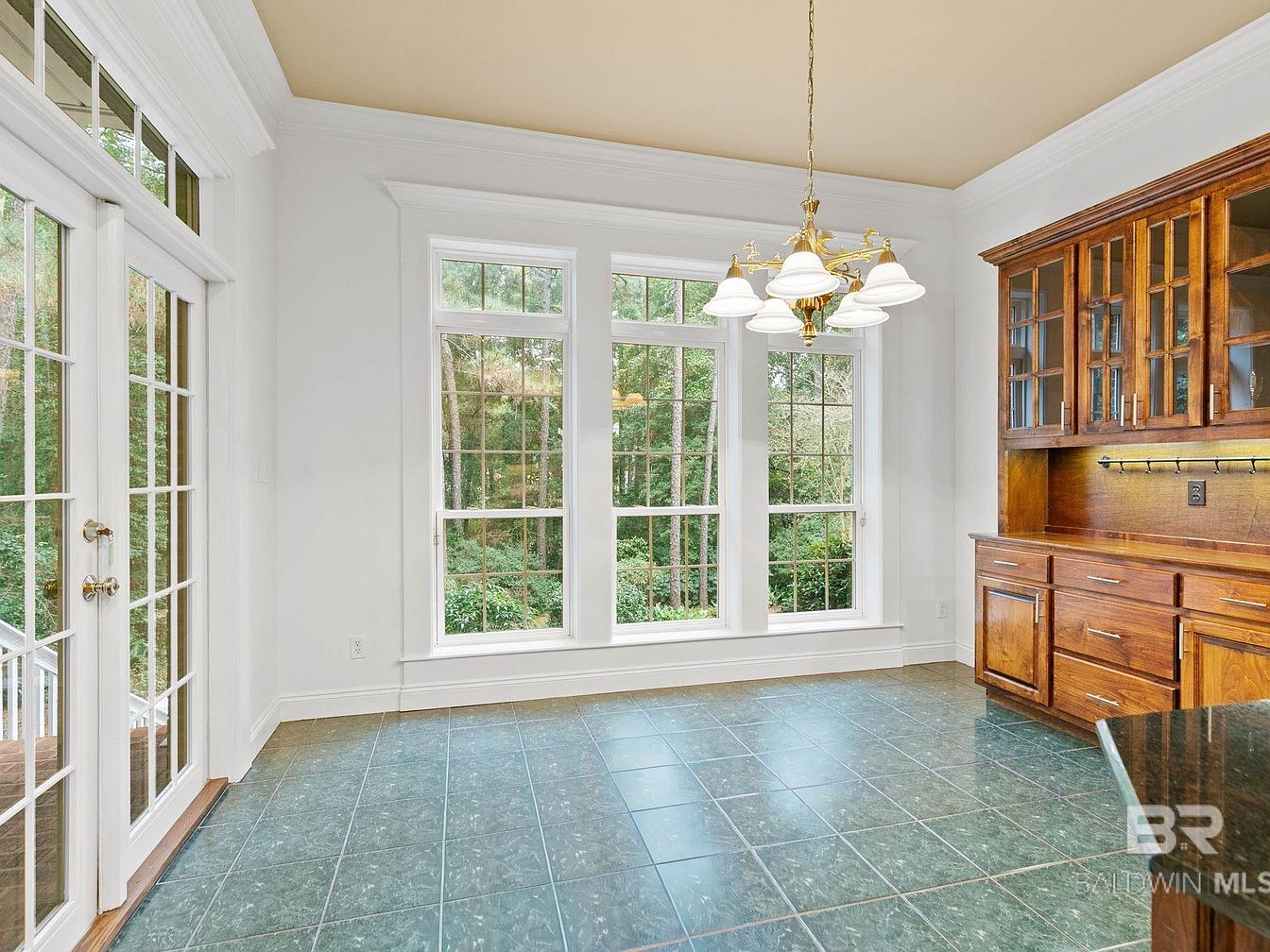 A bright, inviting breakfast nook features large floor-to-ceiling windows that flood the space with natural light while offering serene woodland views. The green patterned tile flooring is both practical and stylish, ideal for families with children or pets. An elegant chandelier in brushed brass centers the space, casting a warm glow for family meals. The built-in wooden buffet with glass-front cabinets adds classic character, providing ample storage for dishes and serving ware. Crisp white walls and trim balance the rich wood and tile accents, creating an airy atmosphere perfect for casual dining and everyday gatherings.