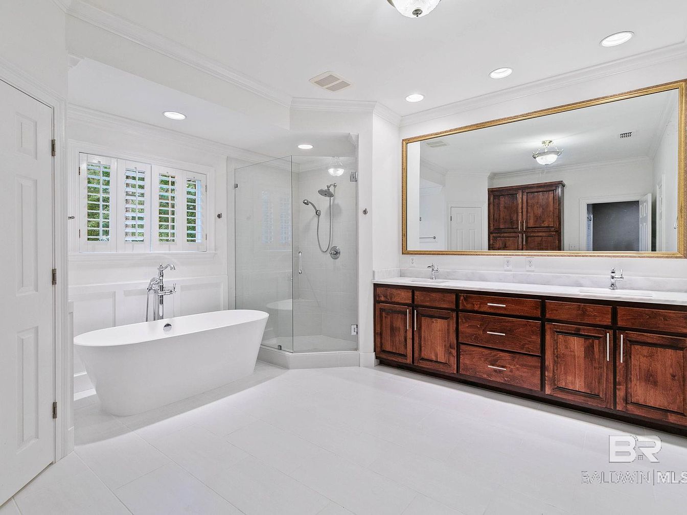 A bright and spacious luxury bathroom features a freestanding modern soaking tub positioned by the window, allowing for natural light and garden views. The expansive glass-enclosed shower provides a spa-like experience, while the double vanity with rich wood cabinetry adds warmth and elegance to the neutral color palette. Gleaming white walls, floor tiles, and countertop surfaces create an airy and clean aesthetic. The oversized wall mirror reflects the space beautifully, enhancing light and depth. Thoughtful storage and generous counter space make this a highly functional and family-friendly space, ideal for relaxation as well as daily routines.