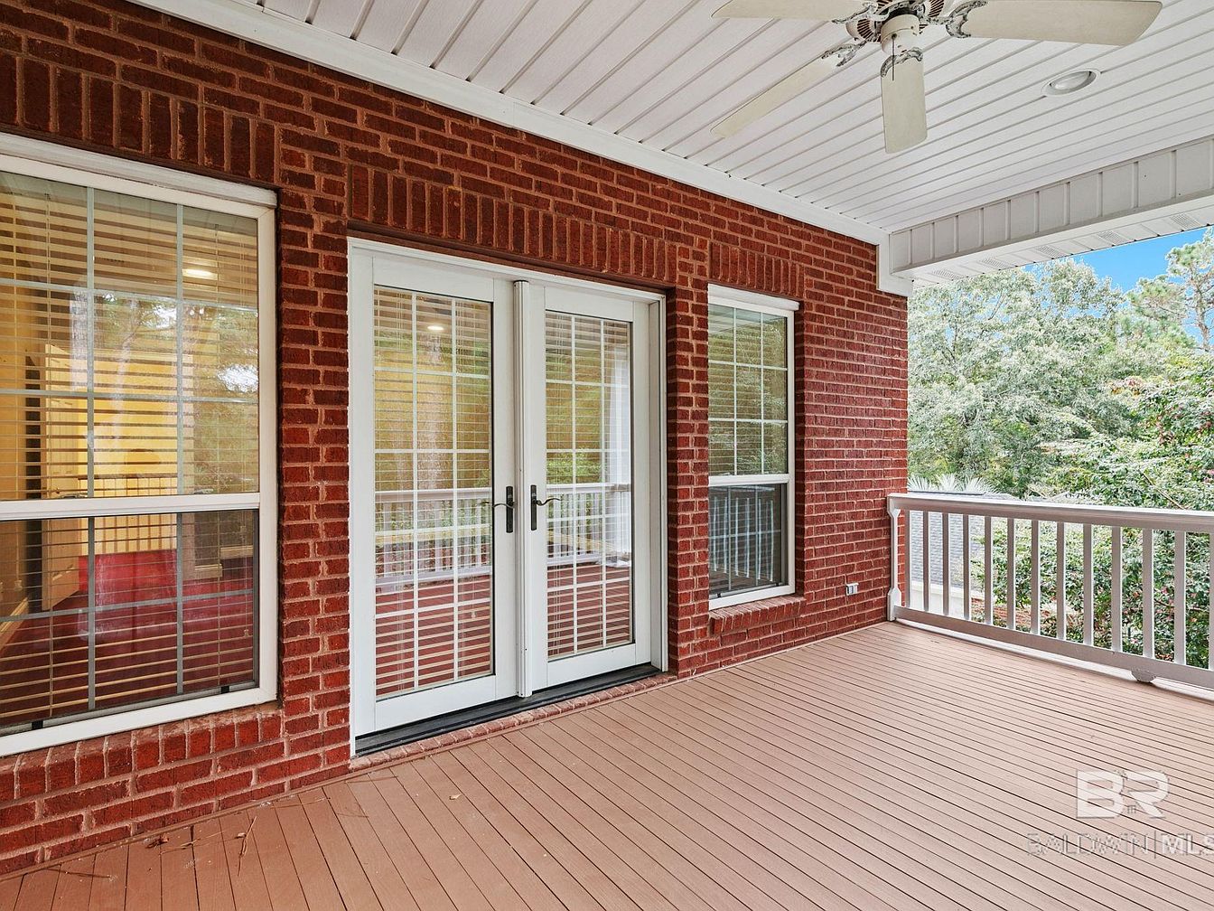 A charming, covered back porch welcomes you with classic red brick flooring and crisp white railings, perfectly framing the surrounding wooded landscape. French doors with glass panes let in abundant natural light and provide seamless indoor-outdoor flow, ideal for family gatherings or morning coffee. The ceiling fan above adds comfort for warm afternoons, while the spacious layout allows room for seating or even a small dining area. The tranquil view of tall pines creates a peaceful, private retreat, and the wide steps offer safe and easy access to the backyard, making this porch ideal for both relaxation and family playtime.