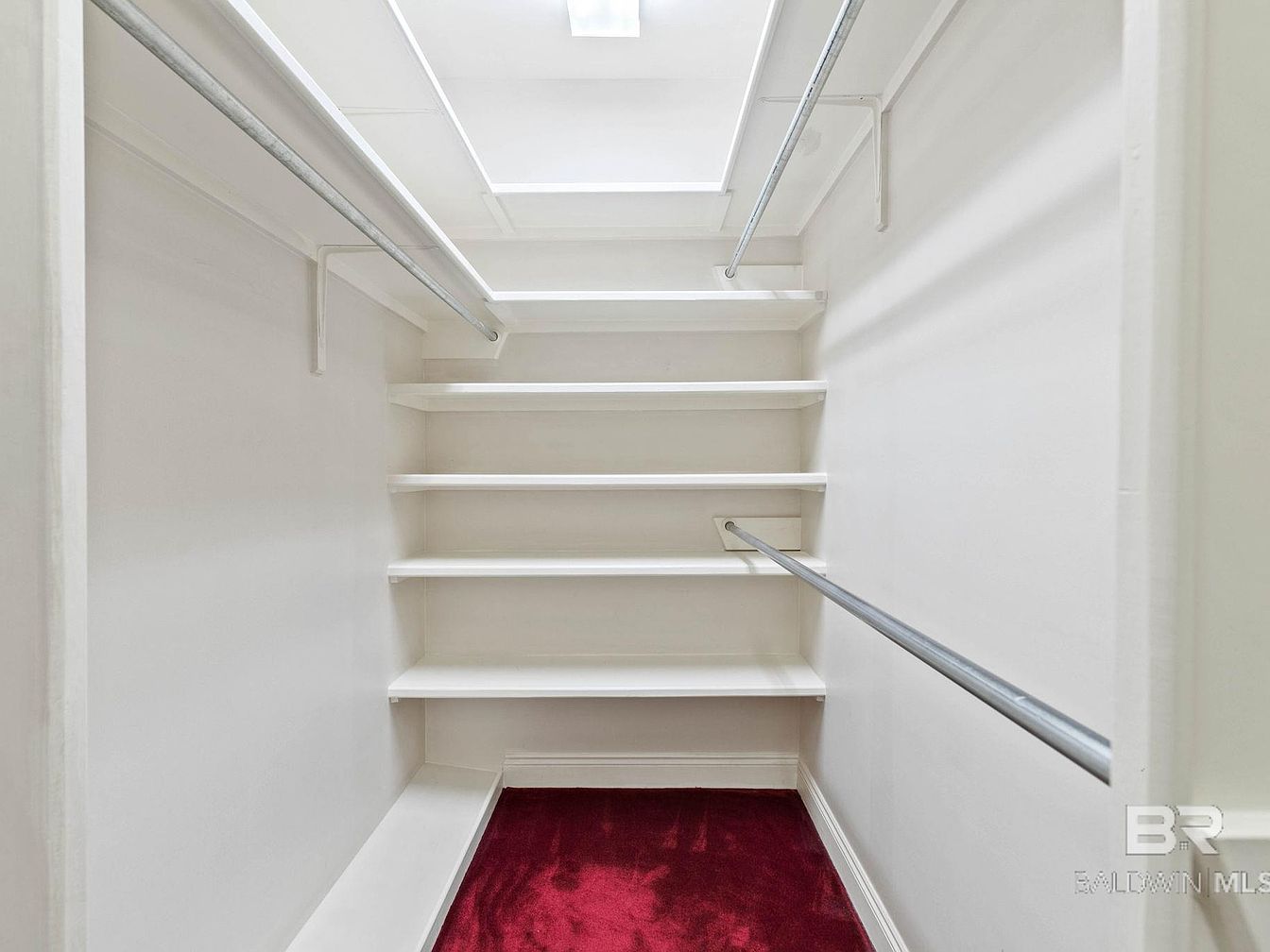 This walk-in closet provides ample storage with built-in white shelving that takes advantage of vertical space, offering multiple levels for organizing clothing and accessories. Dual hanging rods on both sides maximize efficiency for family use, perfect for keeping everyone’s wardrobe in order. The crisp white walls and shelving promote a clean, open atmosphere that feels bright due to a ceiling-mounted light, while a deep red carpet adds a splash of color and warmth underfoot. Simple architectural lines and efficient layout make this space both functional and welcoming for any household.