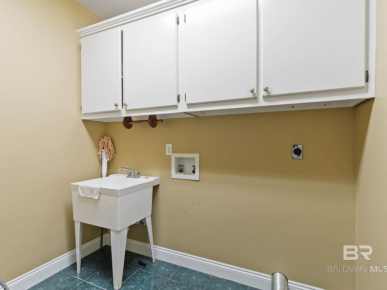A practical laundry room designed for functionality and daily convenience features spacious overhead white cabinetry with plenty of storage for detergents, cleaning supplies, and linens. The utility sink, set against a soft tan wall, is perfect for soaking clothes or handling messier household tasks, while the open space beneath the cabinets is ready for washer and dryer installation. Deep green tile flooring offers durability and is easy to clean, making it an excellent choice for busy family life. Details like the crown molding and bright color palette bring a fresh, inviting feel to this essential household workstation.