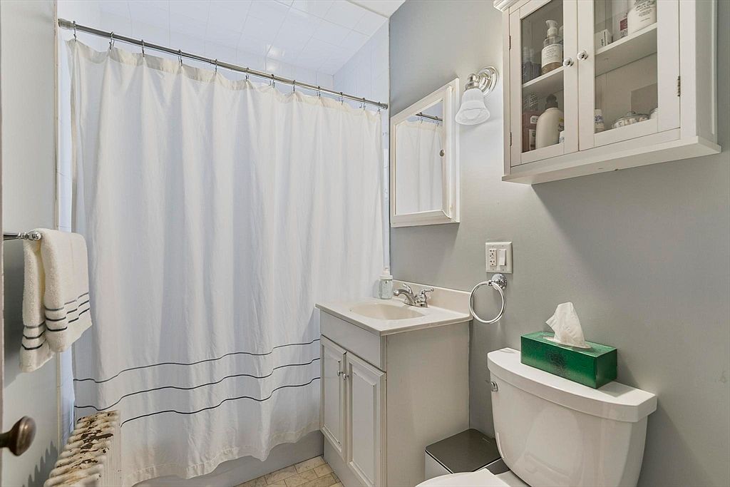 This inviting bathroom features a compact layout, designed for both functionality and comfort. The light gray walls create a soothing backdrop, complemented by a white shower curtain adorned with subtle navy stripes, adding a touch of elegance. A simple yet stylish vanity with a sleek sink provides ample counter space, while a cabinet above offers practical storage for toiletries, keeping the area organized. The soft lighting emanates from a modern fixture, creating a warm ambiance, ideal for relaxing moments. Classic white towels enhance the family-friendly atmosphere, making this space both practical and aesthetically pleasing.