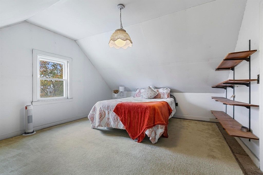 This inviting bedroom features a charming pitched ceiling that adds character to the space. A soft, neutral color palette is enriched with warm accents from vibrant bed linens, creating a cozy atmosphere perfect for relaxation. The bed, adorned with decorative pillows, sits against a minimalistic wall, while a vintage lampshade casts a warm glow, enhancing the tranquil vibe. Natural light floods in through a generously sized window, overlooking lush trees that invite the outside in. Thoughtfully designed, the room includes a rustic wooden shelf for books or personal decor, offering both practicality and warmth to a family-friendly living space.