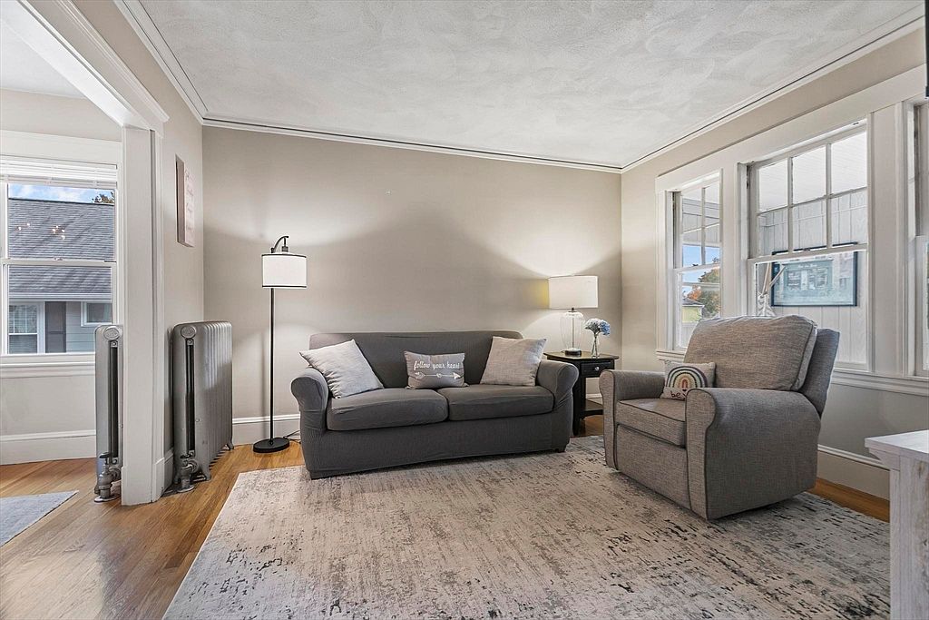 This cozy living room exudes warmth and tranquility, featuring a balanced layout that invites relaxation. Soft gray walls complement the plush, comfortable furnishings, including a chic sofa adorned with textured cushions. A matching recliner provides additional seating, perfect for family gatherings. Natural light floods the space through the multiple windows, enhancing the airy feel. The elegant area rug adds a subtle touch of sophistication, while the sleek floor lamp and simple table harmonize with the room’s aesthetic. Classic architectural details, like the crown molding and rich hardwood flooring, enhance the home’s timeless charm, making it a welcoming retreat.