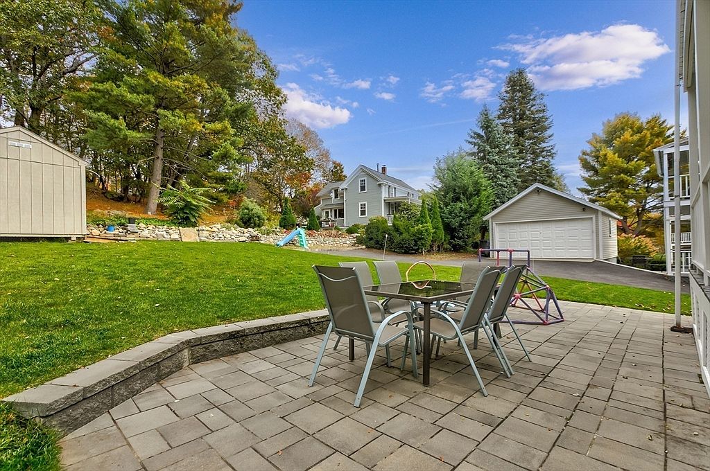 This inviting backyard patio is perfect for family gatherings and outdoor entertaining. The spacious stone pavers create a welcoming area for outdoor dining, featuring a modern glass-topped table surrounded by comfortable chairs. Lush green grass frames the patio, adding a vibrant touch, while mature trees provide delightful shade and a sense of privacy. A children’s play area is nearby, emphasizing the family-friendly nature of the space. The neat, well-maintained landscaping leads the eye toward the backdrop of the charming American home, creating a picturesque setting for relaxation and memorable moments in nature.