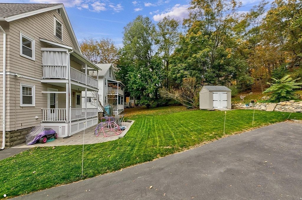 The expansive backyard showcases a well-manicured lawn bordered by lush trees, creating a serene retreat for family gatherings. A spacious patio area is perfect for outdoor dining or play, while a charming shed adds practicality for storage needs. The two-story home features elegant siding and inviting balconies, enhancing the overall aesthetic appeal. Family-friendly elements, like ample space for children to play and a playful swing set, make this yard ideal for young ones. The natural color palette, complemented by soft greens and warm browns, blends harmoniously with the surrounding landscape, inviting relaxation and connection with nature.