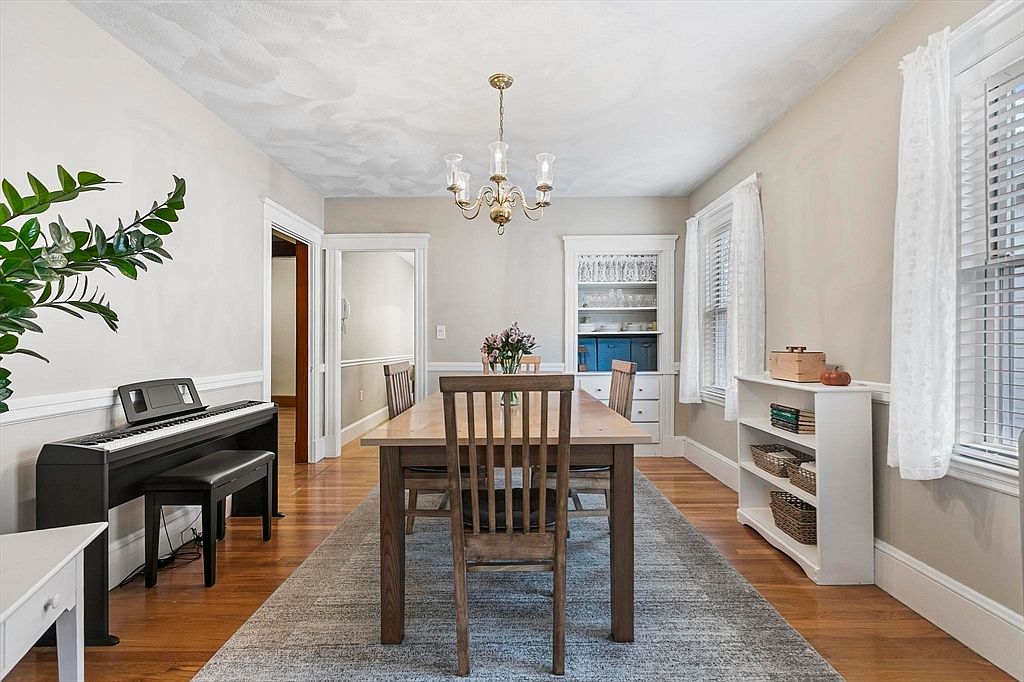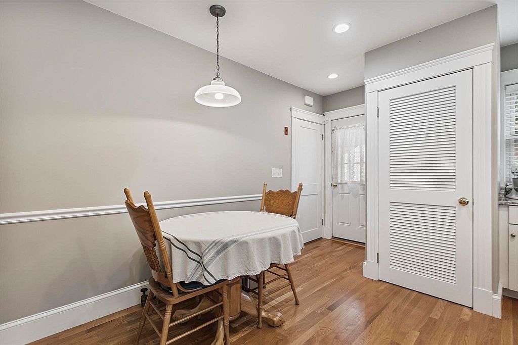 This inviting dining nook features a simple yet appealing layout that encourages family gatherings. The wooden table, dressed in a soft, draped cloth, complements the warm, honey-toned hardwood flooring, creating a cozy atmosphere. Light gray walls enhance the spacious feel, while elegant wainscoting adds a touch of sophistication. The vintage-style hanging pendant light casts a warm glow, highlighting the charming wooden chairs. Natural light filters through a nearby window, enhancing the cheerful ambiance. Conveniently located near the kitchen, this nook serves as a perfect space for casual meals and cherished conversations, making it an ideal family-friendly spot.