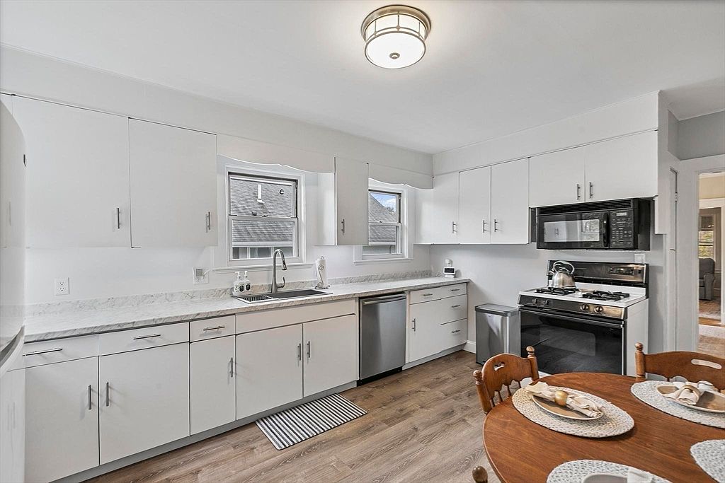 A spacious kitchen featuring sleek, white cabinetry complements the contemporary aesthetic with minimalist charm. The layout includes a generous countertop, creating an ideal workspace for culinary adventures. Stainless steel appliances, including a gas stove and refrigerator, provide both style and functionality. Abundant natural light streams through well-placed windows, enhancing the airy atmosphere. The warm wood flooring adds a cozy touch, inviting family gatherings at the round dining table, adorned with tasteful table settings. The strategic use of colors blends seamlessly, making this kitchen not just a cooking space, but a welcoming heart of the home.